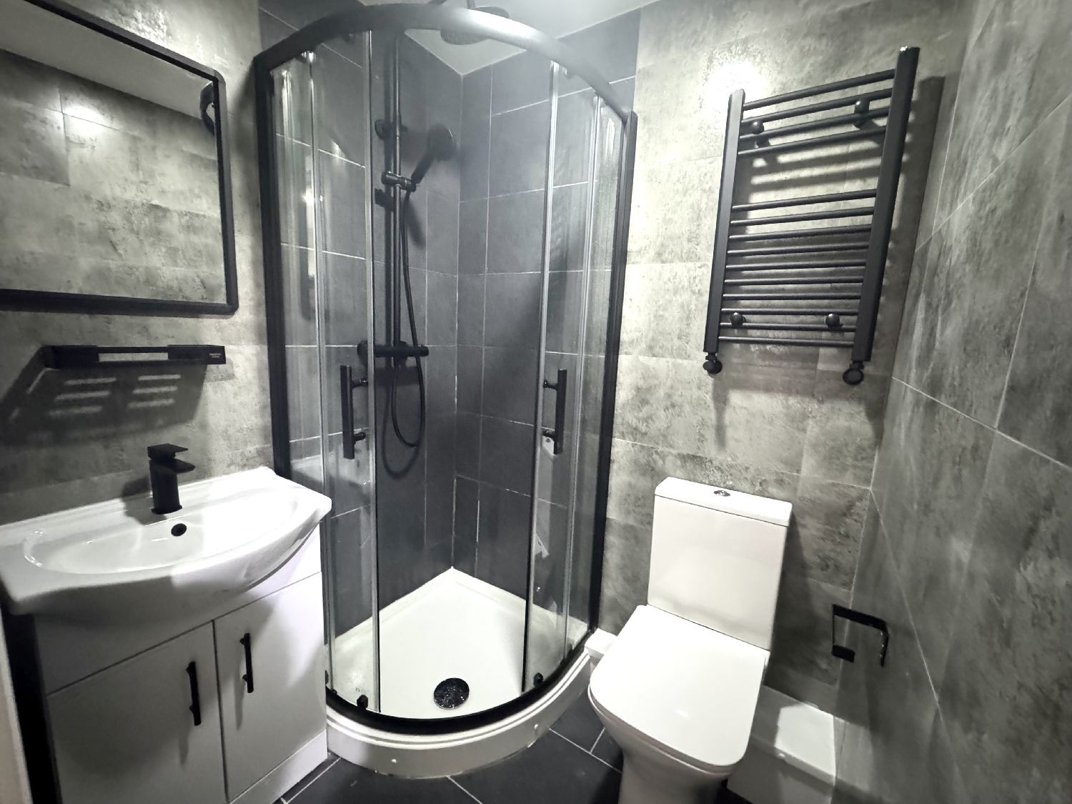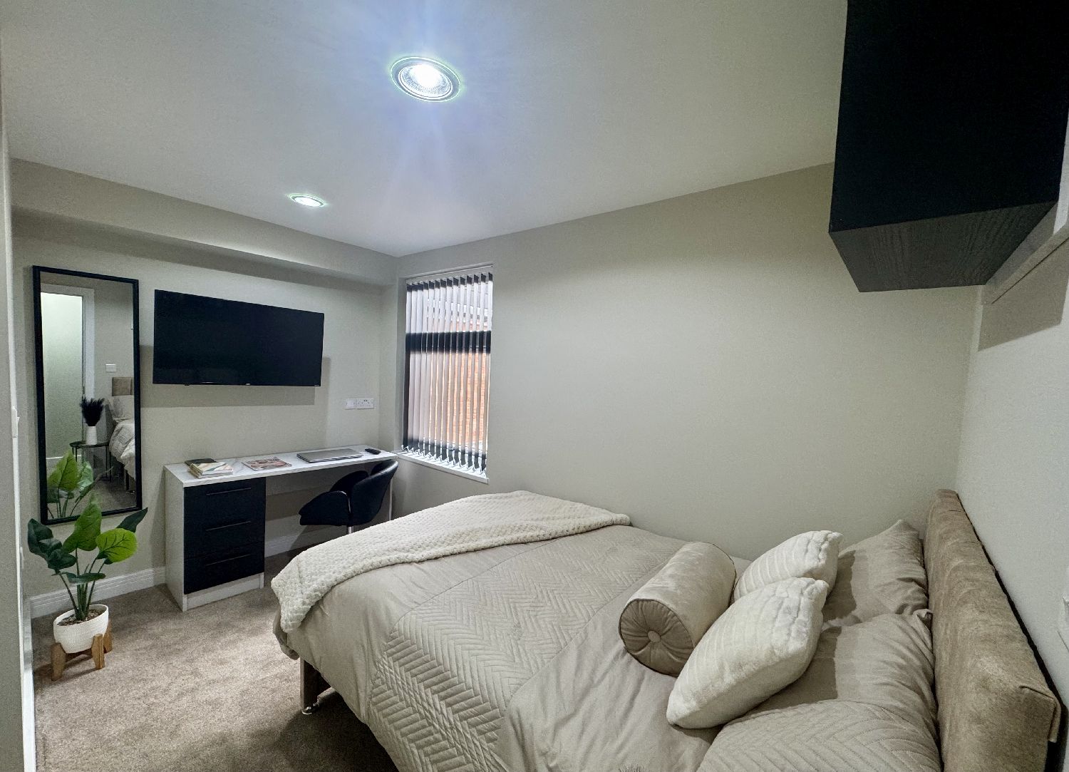 The centrepiece of the home is the large open-plan kitchen and lounge area, which has been completely redesigned with a modern and stylish aesthetic. It features deep green shaker-style units, black appliances, and matching accent tones that give the space a bold and contemporary feel. There’s plenty of storage and worktop space, as well as integrated appliances for ease of use. The lounge also includes a large 55-inch Smart TV, perfect for shared movie nights, gaming, or relaxing after lectures.