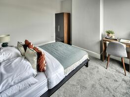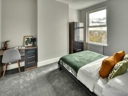 The house features 5 spacious double bedrooms, each fully furnished with a bed, mattress, wardrobe, chest of drawers, desk, and chair, providing ample space for study and relaxation.