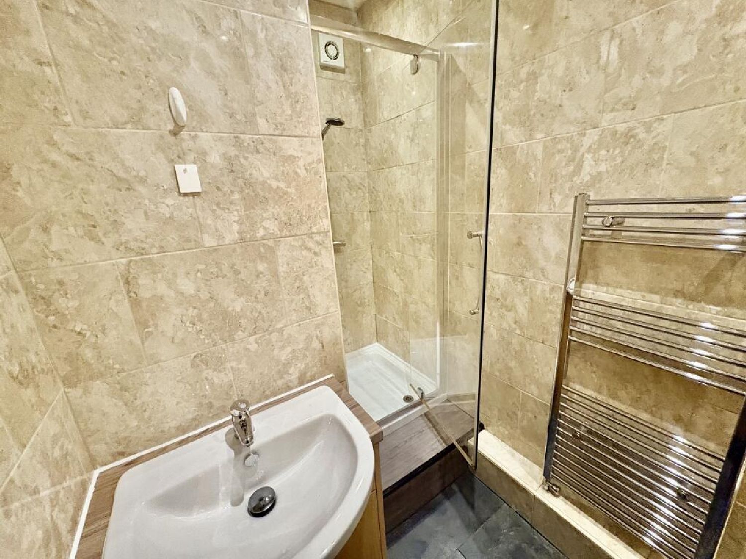 The ground floor features a welcoming entrance hallway leading to a generous communal living area, a contemporary fitted kitchen complete with essential appliances, a shower room, and one double bedroom.