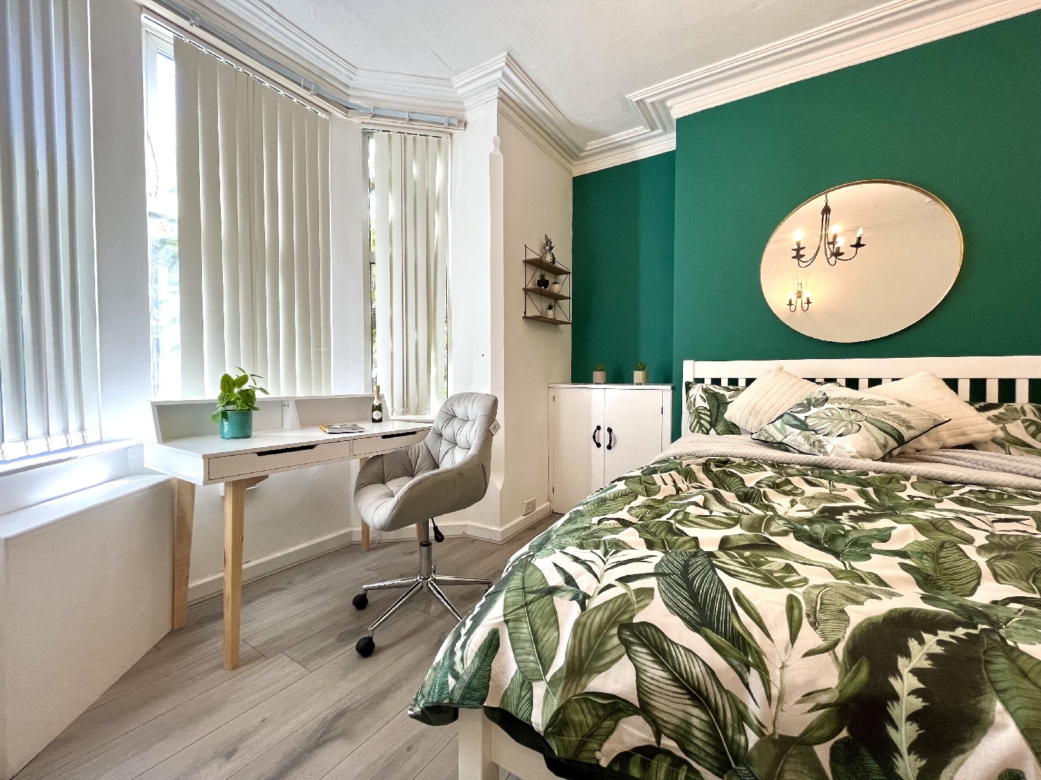 The ground floor bedroom has had all new flooring with all new furniture including a large double bed, new mattress, desk, comfy desk chair, stylish green chest of drawers and wardrobe to match.