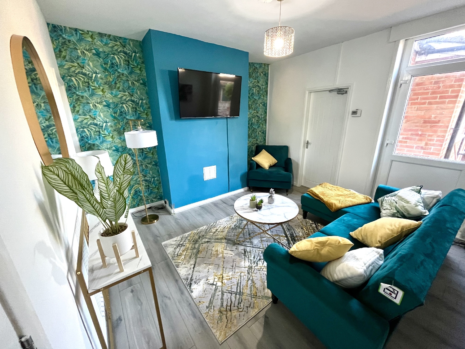 The lounge is now made up on a teal coulour corner sofa, marble affect coffee table, a large 55 inch smart TV and wall art. The kitchen has had all new grey speckled work tops and cupboards installed with a brand new microwave.