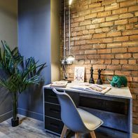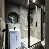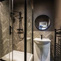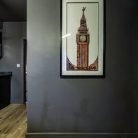 This charming ground-floor one-bedroom flat is full of character and perfect for city living. Step into a welcoming hallway with a handy storage cupboard, leading to a cozy living area featuring a large flat-screen TV (included). A separate dining space flows into a sleek, high-gloss black kitchen, elevated on a stylish mezzanine level.