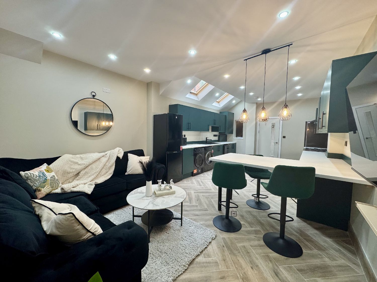 The centrepiece of the home is the large open-plan kitchen and lounge area, which has been completely redesigned with a modern and stylish aesthetic. It features deep green shaker-style units, black appliances, and matching accent tones that give the space a bold and contemporary feel. There’s plenty of storage and worktop space, as well as integrated appliances for ease of use. The lounge also includes a large 55-inch Smart TV, perfect for shared movie nights, gaming, or relaxing after lectures.