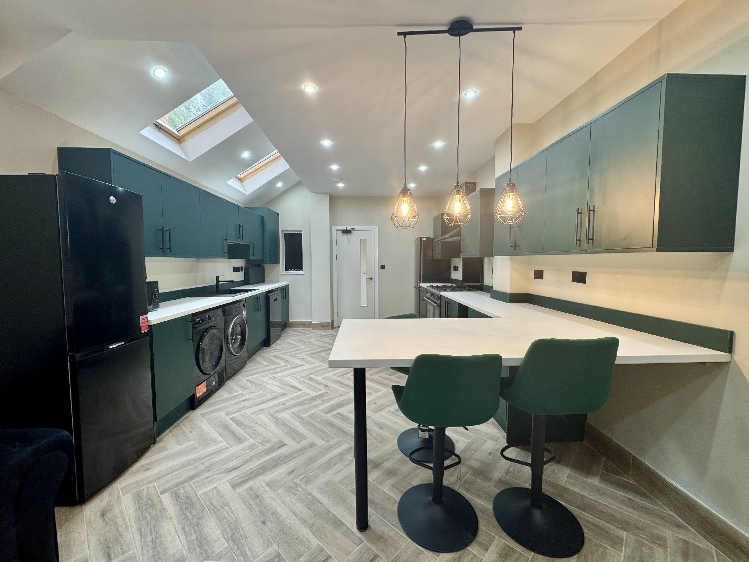 The centrepiece of the home is the large open-plan kitchen and lounge area, which has been completely redesigned with a modern and stylish aesthetic. It features deep green shaker-style units, black appliances, and matching accent tones that give the space a bold and contemporary feel. There’s plenty of storage and worktop space, as well as integrated appliances for ease of use. The lounge also includes a large 55-inch Smart TV, perfect for shared movie nights, gaming, or relaxing after lectures.