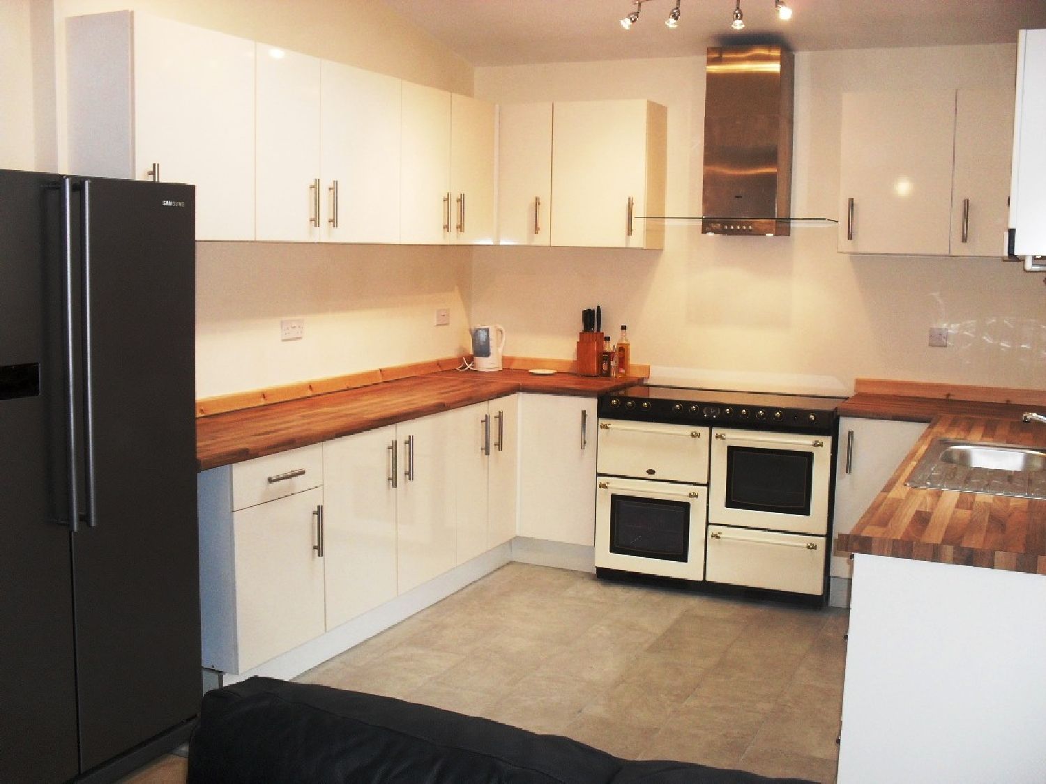 The large Kitchen / lounge area is great to hang out and entertain, with a double range oven and double American fridge, leather sofas and hard wood flooring.